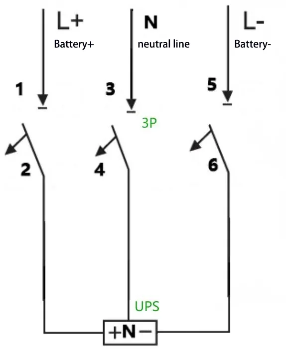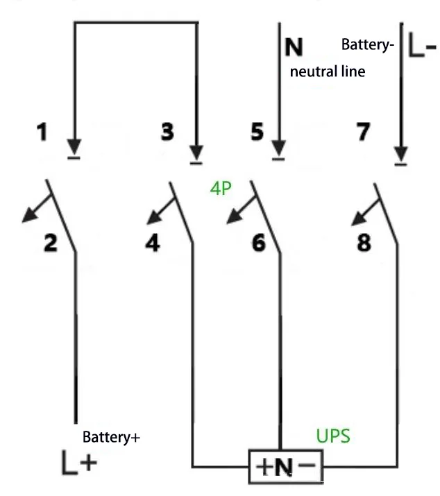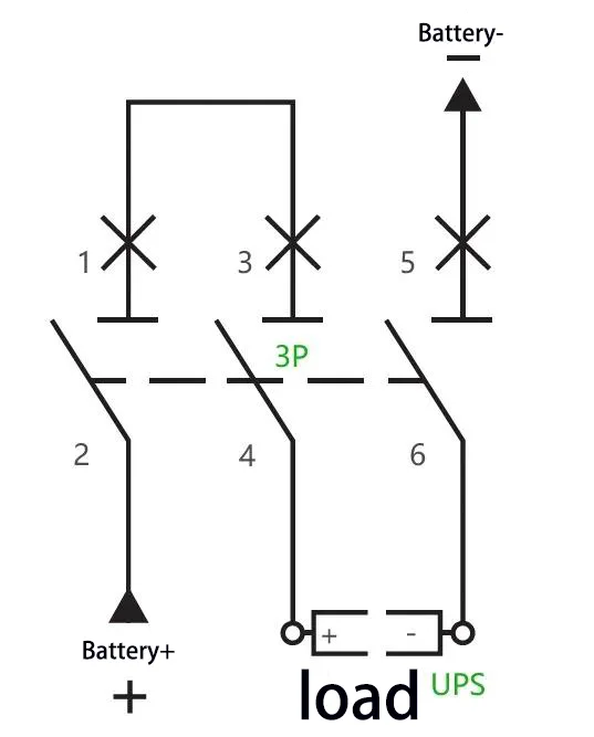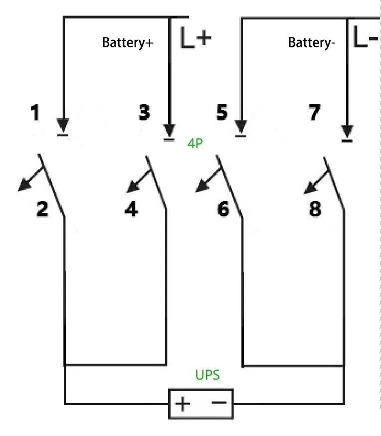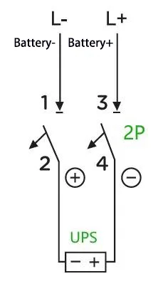 Е:На пример: За UPS-от со капацитет од 40 kVA, номинална батерија од 40 ќелии и поврзување со неутрална жица (изедначувачки напон на полнење: 14 V × 40 = 560 V, т.е., ±280 V), максималната работна струја се пресметува како 40 kVA × 1,0 %÷1 ÷1 × 1,0% ÷10 A. Може да се усвои прекинувач 4P 750 V 150, со два од неговите полови поврзани во серија. Методот на поврзување е како што следува: